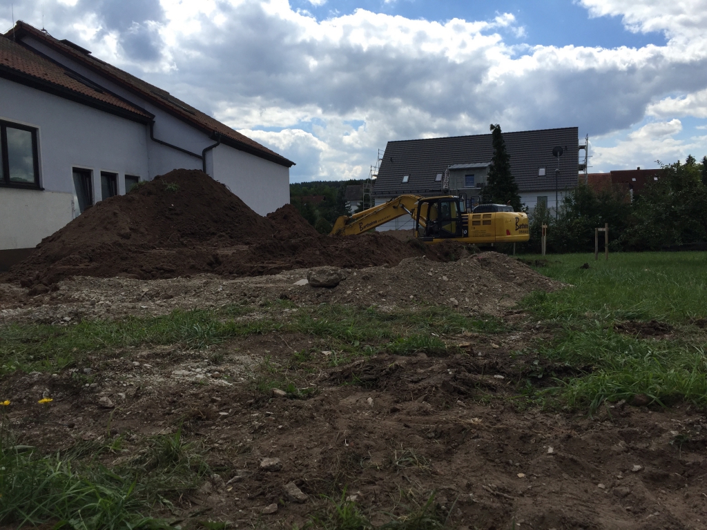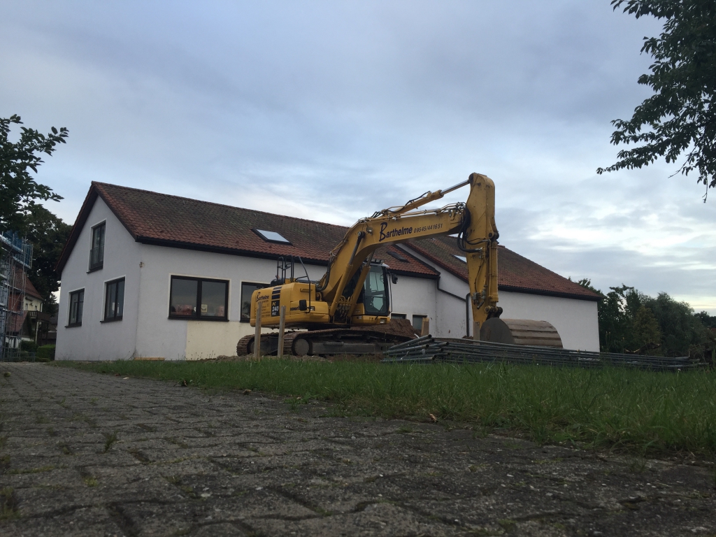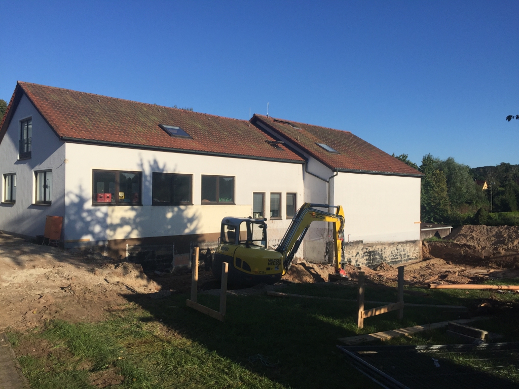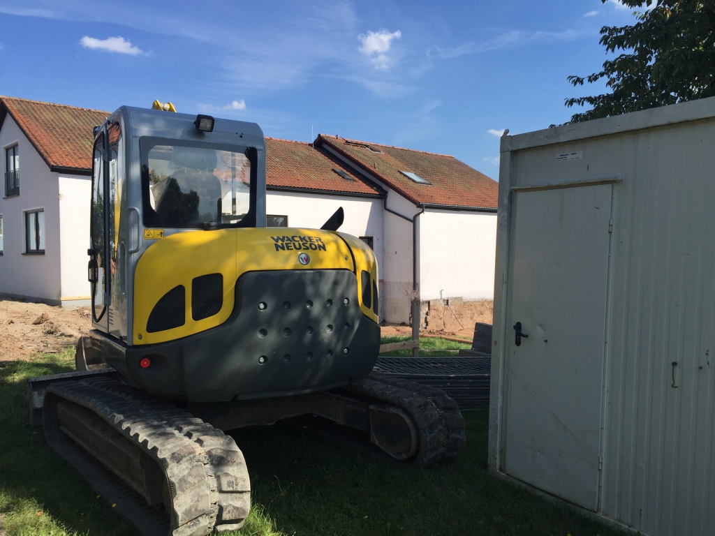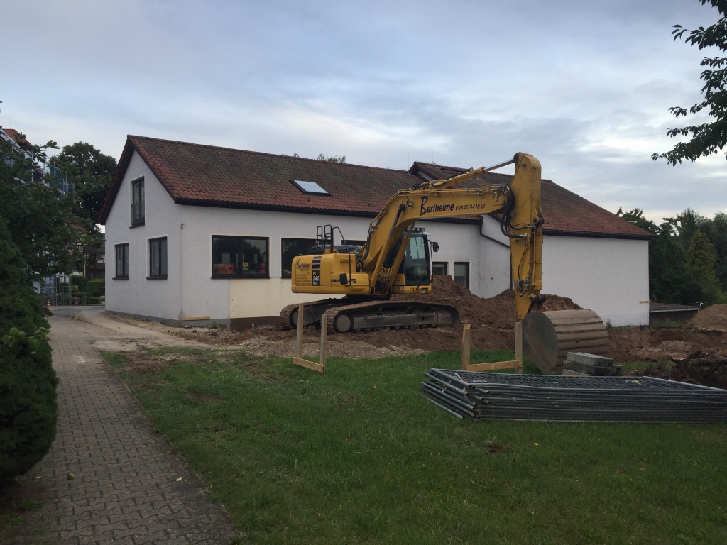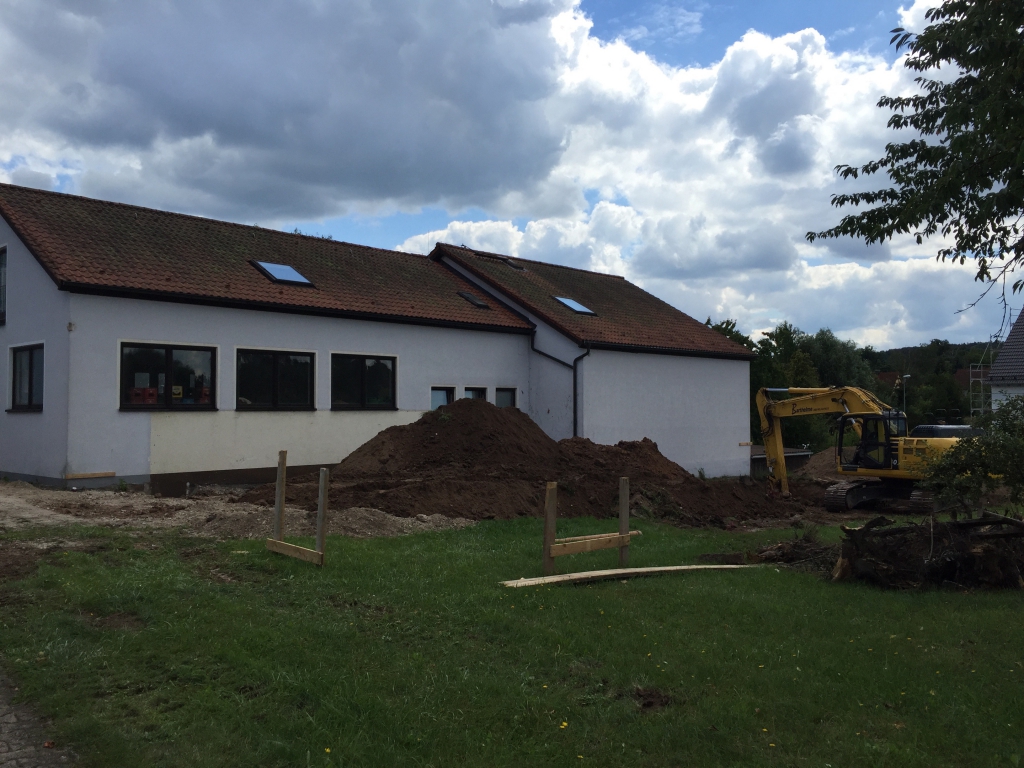 Mittlerweile haben auch die Arbeiten am Gerätehaus begonnen. Die Baugrube wurde ausgehoben, damit der Untergrund für das den Anbau vorbereitet werden kann.