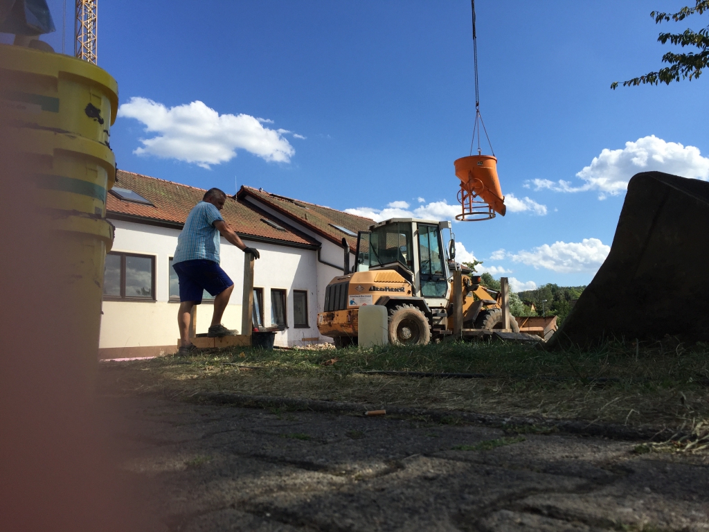 Anschließend wurde das bestehende Gebäude soweit vorbereitet, dass die ersten Fundamente gegossen werden konnten. Da der Kran direkt vor der Ausfahrt des Mehrzweckfahrzeuges steht, muss dieses über die Zeit des Umbaus in den Gemeindebauhof umziehen.