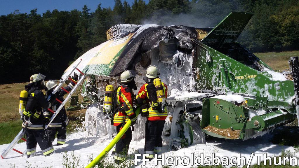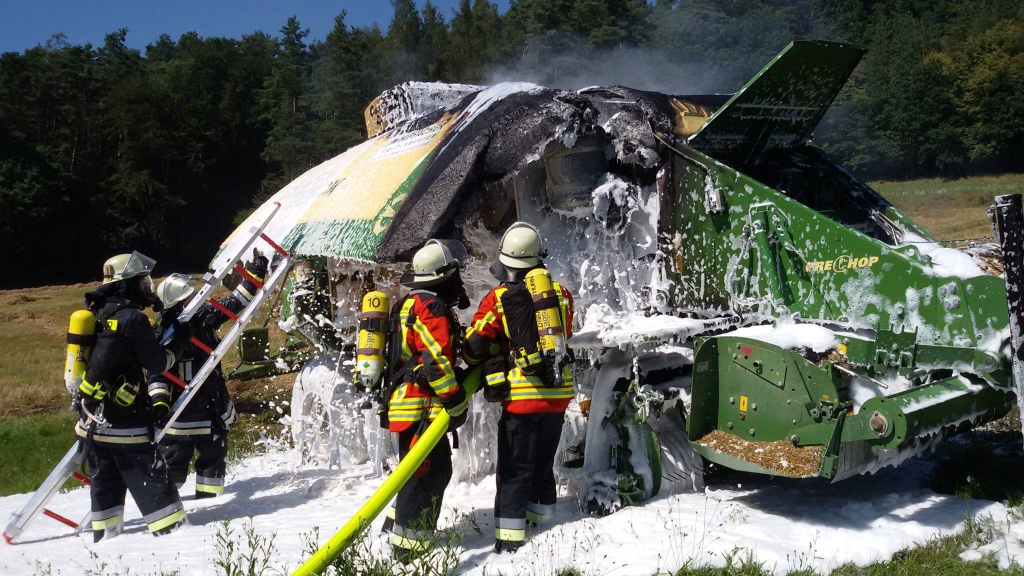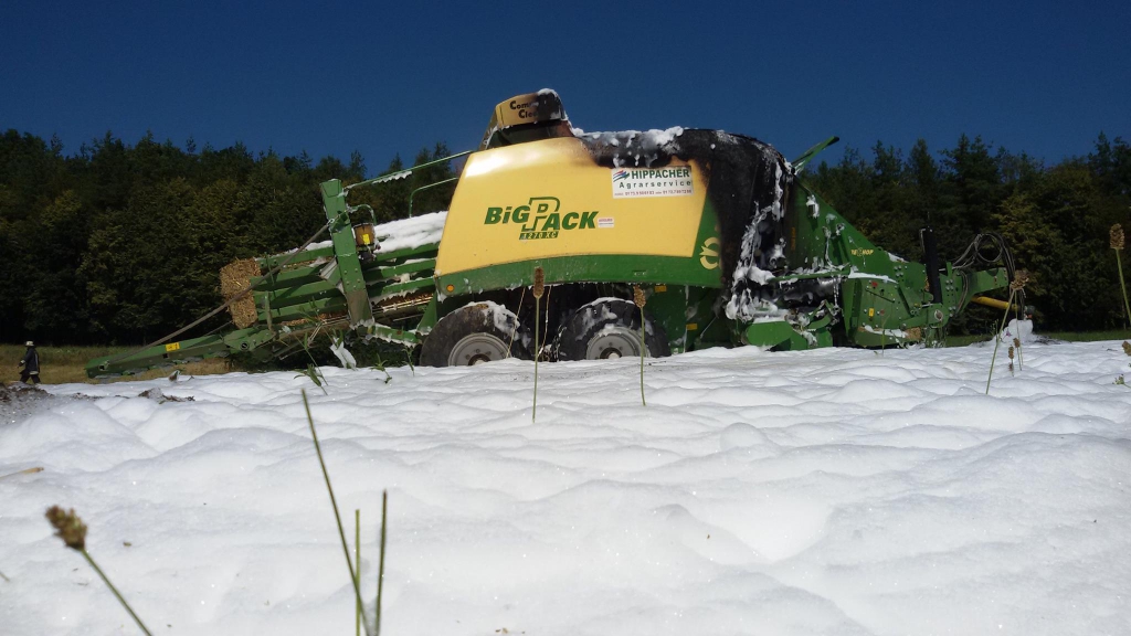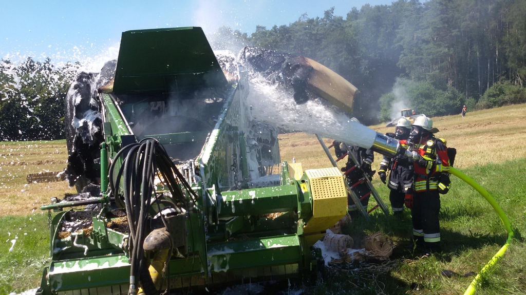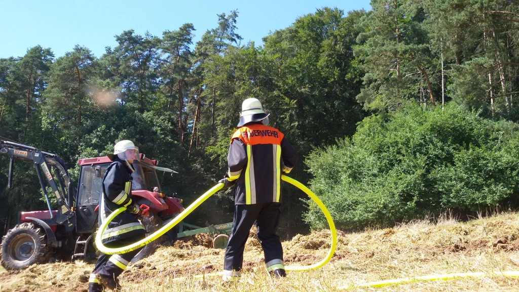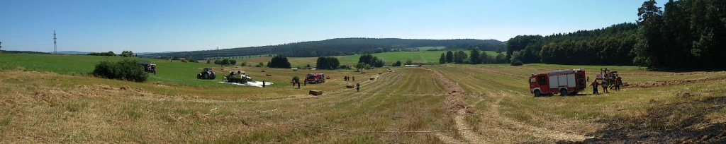Eine Ballenpresse war auf einem Feld am Ortsausgang von Oberwimmelbach in Brand geraten, der Fahrer des Gespanns schaffte es noch das Gefährt auf eine angrenzende Wiese zu fahren. Teile des Feldes sowie die Presse selbst standen in Brand. Unter schwerem Atemschutz wurde ein Mittelschaumrohr vorgenommen und der Brand bekämpft, gleichzeitig wurde der sich ausdehnende Brand auf dem Feld bekämpft.