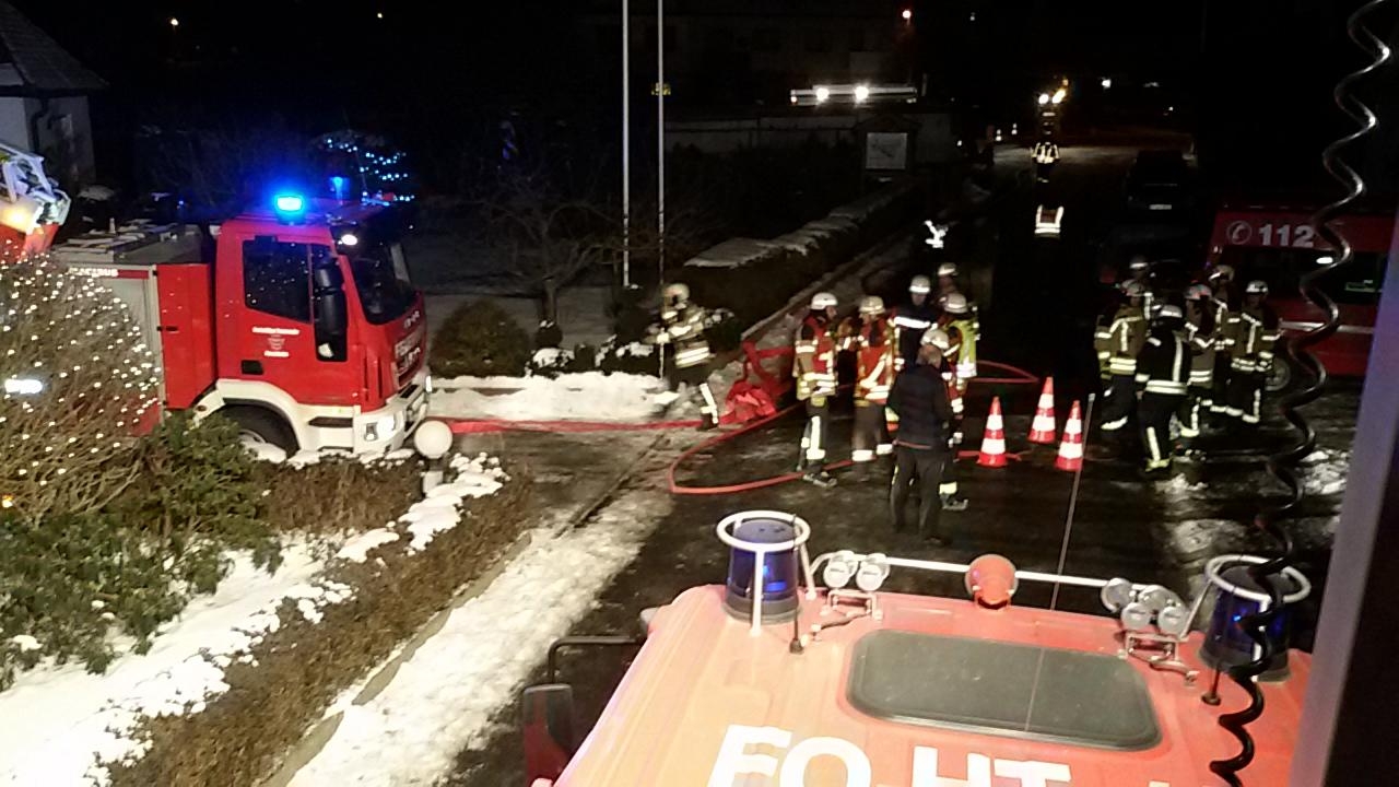 Eine Schreinerei stand in Vollbrand. Schnell wurde ein erster Löschangriff aufgebaut. Gerade als die Einsatzkräfte das Gebäude betreten wollten, kam es zu einer Explosion, welche Teile des Daches in die Luft schleuderte.