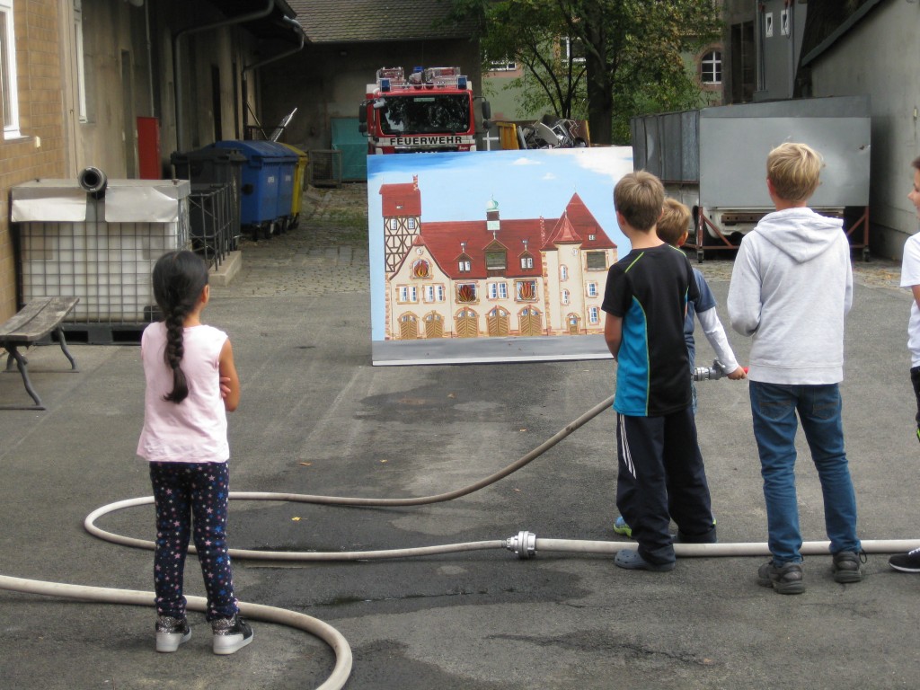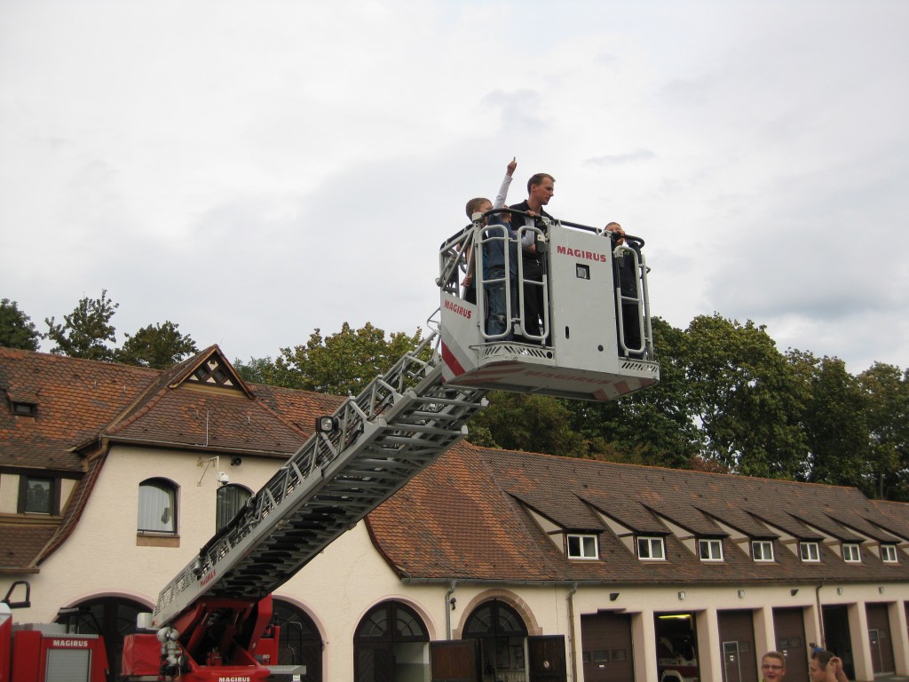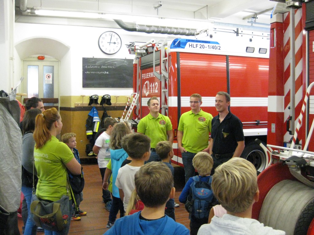 Im Oktober besuchten die Feuerdinos die Wache 1 der Berufsfeuerwehr in Nürnberg. Thomas und René, zwei der aktiven Feuerwehrkollegen, führten uns durch ihren Arbeitsplatz. Neben den Löschfahrzeugen, Sonderfahrzeugen und der Drehleiter konnten wir auch die Aufenthalts- und Schlafräume der Berufsfeuerwehrmänner besichtigen. Nach einer kurzen praktischen Übung, bei der eine Miniaturnachbildung der Wache 1 „gelöscht“ werden musste, durften alle Kinder die Drehleiter ausprobieren, somit hatten alle die Möglichkeit Nürnberg aus 31m Höhe zu betrachten. Diese Höhe entspricht der Höhe des Drehleiterkorbes, wenn dieser voll ausgefahren ist.