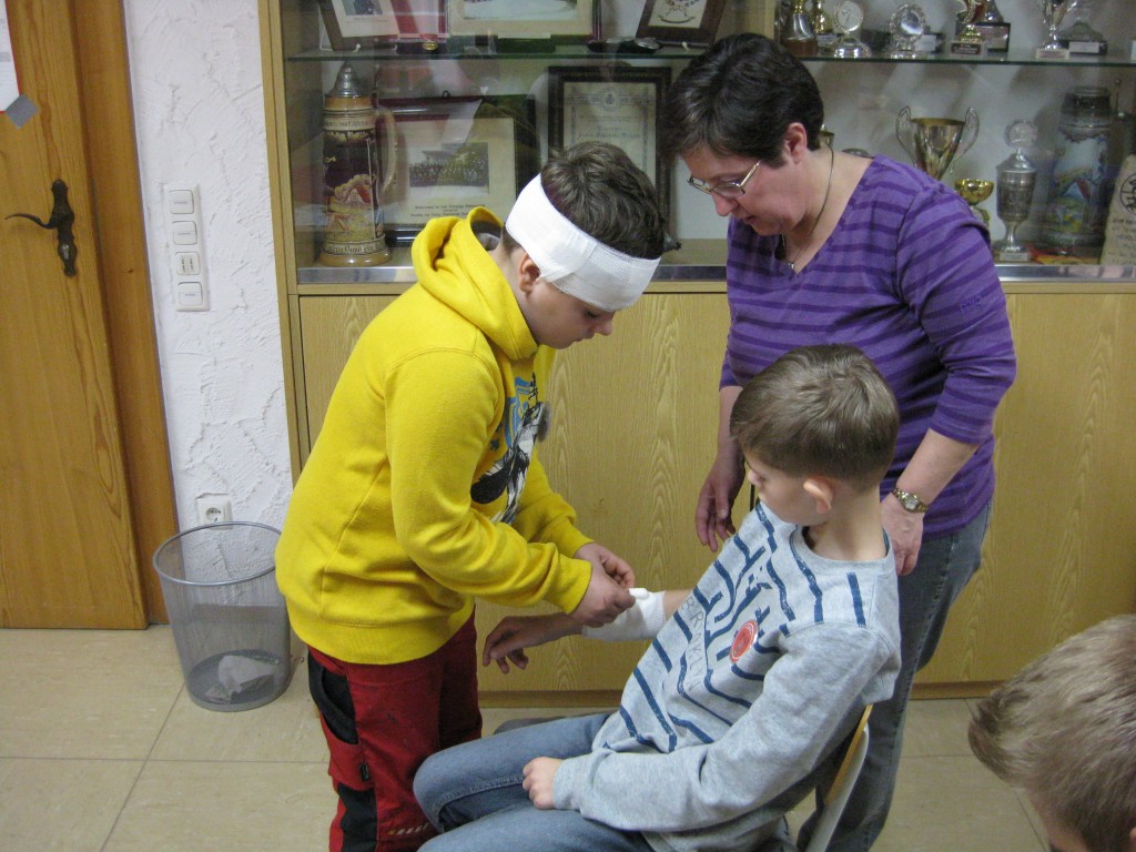 Unter diesem Motto übten die Jugend- und Kinderfeuerwehr am Samstag das Thema „Erste Hilfe“. Zu Beginn wurde von zwei Ärzten gezeigt, wie man Verletzungen verbindet. Hierzu wurden verschiedene Schnitt- und Platzwunden mit Schminke simuliert, damit die Kinder und Jugendlichen diese verbinden konnten. Im zweiten Teil wurde ein Rettungswagen des BRK Forchheim genauer unter die Lupe genommen. Ein Sanitäter demonstrierte die Trage und erklärte die wichtigsten Funktionen und Möglichkeiten .