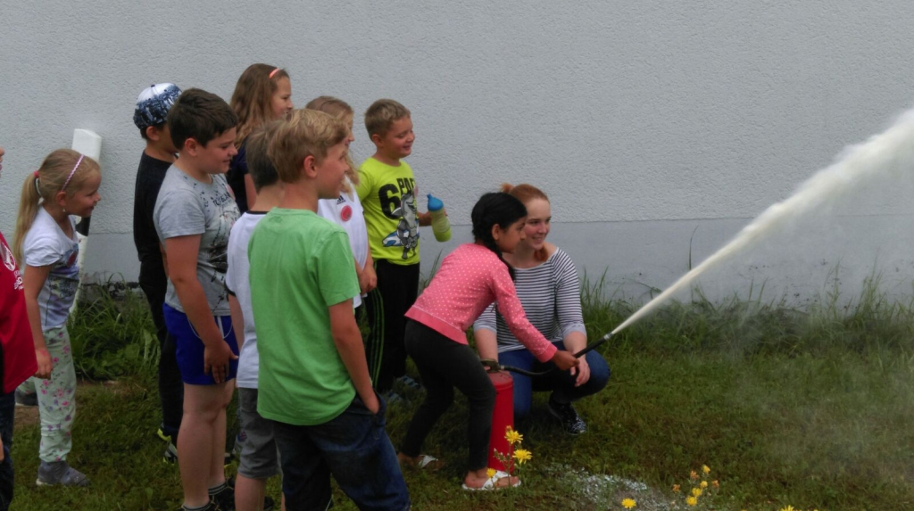 Damit der Spaß nicht zu kurz kommt, durften die Kinder am Schluss noch Feuerlöscher auf einer Wiese ausprobieren und sich bei einer Runde Brennball austoben.