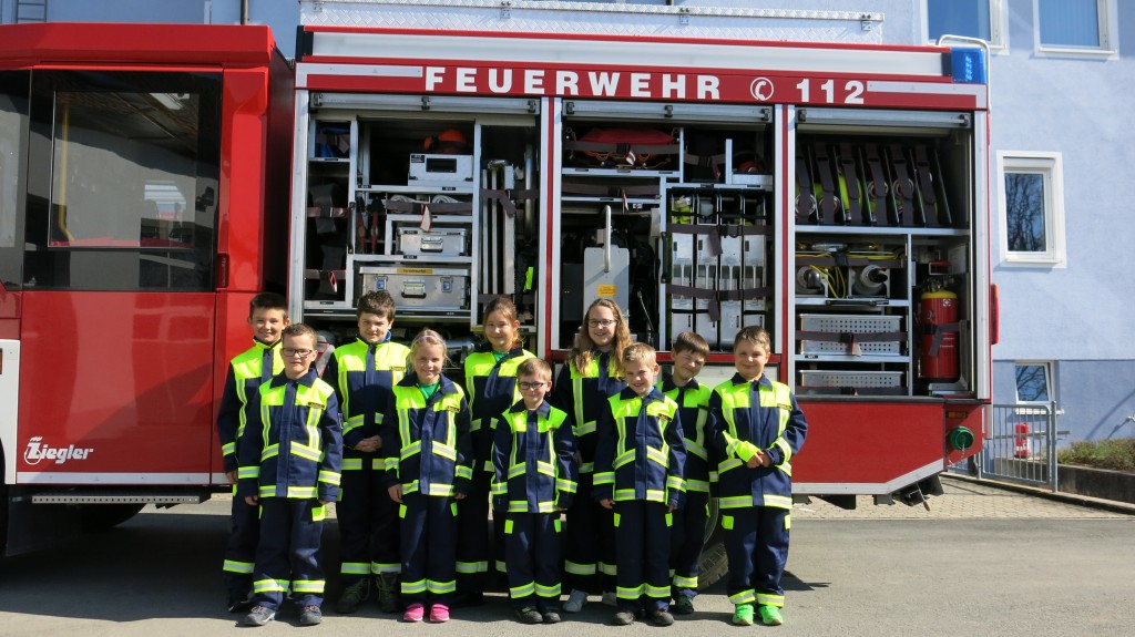 Nach einer langen Wartezeit konnten die Feuerdinos ihre neuen Schutzanzüge in Empfang nehmen. Die Kinder können so nun üben wie die Großen. Jedes Kind konnte eine Überjacke und die passende Überhose an- und ausprobieren. Dazu gab es ein eigenes Namensschild für die Jacke, für alle ein Rückenschild mit der Aufschrift „Feuerdinos Heroldsbach/Thurn“ und ein Ärmelabzeichen mit dem Logo der Feuerdinos.