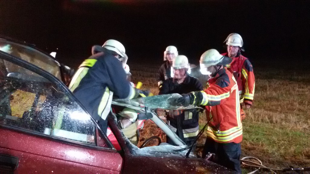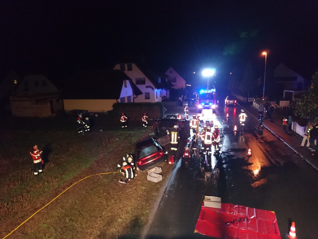 Beim Eintreffen an der Einsatzstelle fanden die Helfer folgendes Bild vor: Ein Fahrzeug lag auf der Seite, das Zweite war leicht in einen Graben gerutscht. Beide Fahrer waren in ihren PKWs eingeklemmt.