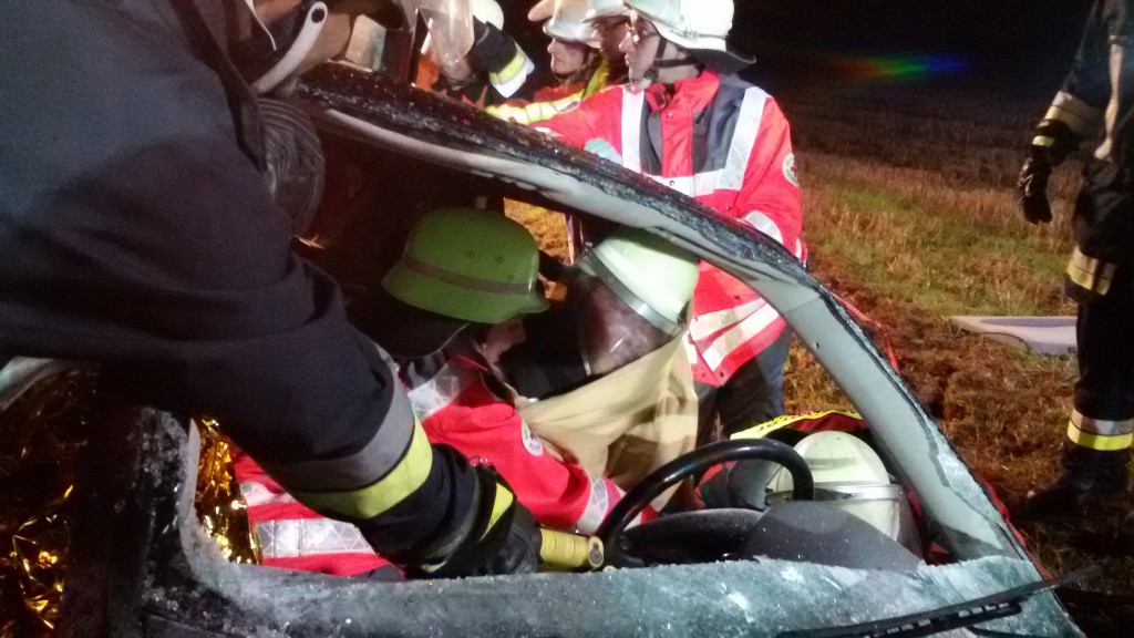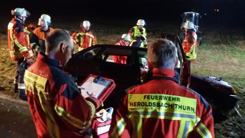 Gegen 18:57 wurden wir gemeinsam mit den Kollegen des BRK Bereitschaft Forchheim zu einem Verkehrsunfall mit mehreren eingeklemmten Personen alarmiert. Am Ortsausgang von Thurn Richtung Hausen waren zwei Fahrzeuge frontal zusammengestoßen.