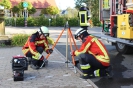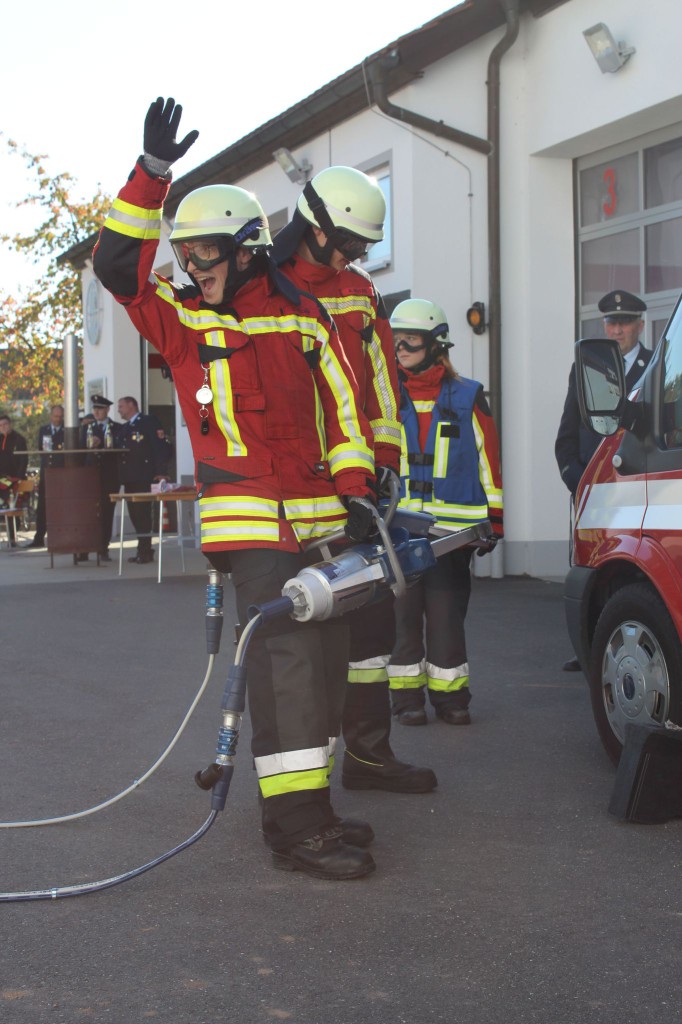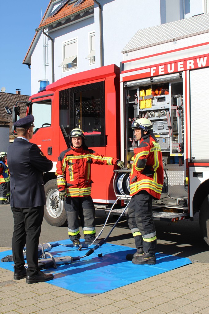 Im Rahmen der Leistungsprüfung muss die Gruppe innerhalb von 240 Sekunden das verunfallte Auto sichern, sowie den Fahrer schonend retten. Gleichzeitig muss eine Sicherung der Brandgefahr gewährleistet und eine Verkehrsabsicherung aufgebaut werden. Ein ineinandergreifendes Arbeiten der verschiedenen Trupps ist daher unerlässlich. Weiterhin müssen, entsprechend der jeweiligen Leistungsstufe, Zusatzaufgaben bearbeitet werden. Die Zusatzaufgaben reichen dabei vom Abfragen von Feuerwehrgrundwissen, über Erkennen von Gefahrgut-Kennzeichen, hin zu Gerätekunde am Großfahrzeug. KBI Schmitt stellte in seinen lobenden Worten besonders heraus, dass es sich bei der abgelegten Leistungsprüfung um eine gute Leistung der Teilnehmer handelte. Es sei keinesfalls selbstverständlich, dass gleich zwei Gruppen so ruhig und koordiniert mit Null Fehlern die Leistungsprüfung bestehen. Auch die Feuerwehrführung bedankt sich auf diesem Wege noch einmal recht herzlich bei den Teilnehmern und Teilnehmerinnen der Prüfung und ist stolz auf die starke Leistung der Gruppen! Die Führungskräfte der Kreisbrandinspektion übergaben am Ende allen Teilnehmern und Teilnehmerinnen ihre Abzeichen, die von der Stufe Bronze bis zur letzten Stufe Rot-Gold reichten. Im Anschluss an die Leistungsprüfung durfte natürlich ein gemütlicher Ausklang mit einer deftigen Stärkung nicht fehlen.